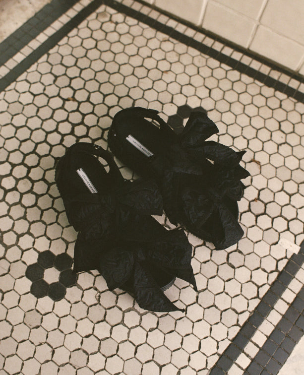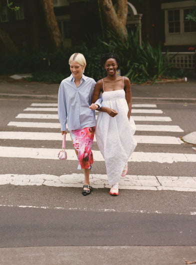Pictured on the left Annabella wears Low Classic, Kourh, Ganni and Jacquemus. Elesi wears Cecilie Bahnsen.
