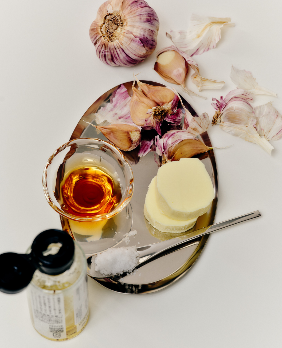 Place eight thinly sliced garlic cloves into a saucepan and cover with vegetable oil. Cook over medium–high heat, stirring constantly, until the garlic is lightly golden. Remove the garlic from the oil immediately, straining and transferring to a paper towel. Once cool, crush the garlic and pop into a mixer along with 240 grams of unsalted butter, two teaspoons of ground shio kombu*, 1.5 tablespoons of brown rice vinegar, 3 teaspoons of white soy sauce, 1 teaspoon of finely ground white peppercorns and 1 teaspoon of sea salt flakes. Beat to combine, seasoning to taste and store in the refrigerator or freezer.